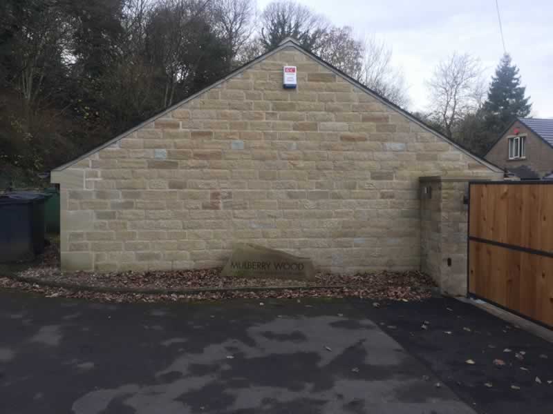 Mr and Mrs Woodings of Honley commissioned us to do various jobs on their property which included using our Yorkshire tumbled wall stone for the garage and walls of their home. We made the wall stone for the Garage and surrounding walls from our locally sourced Yorkshire stone. We also made the heads, cills and pillar caps to suit.